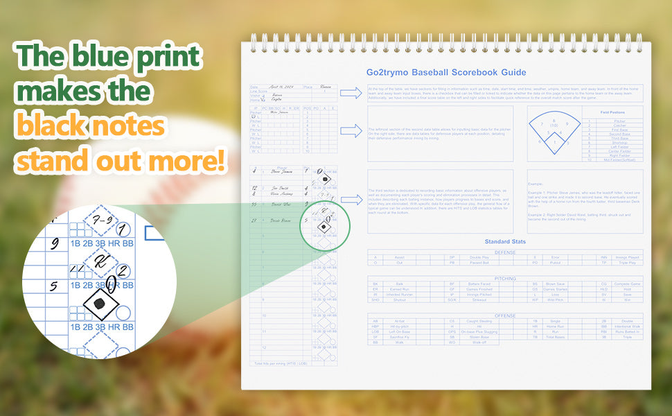 - 【68 Games Baseball Scoring Book】Go2trymo scorebook offers double the capacity of standard scorebooks, enabling you to track stats for both teams throughout an entire season of 68 games with 12 innings and 12 player lineup.