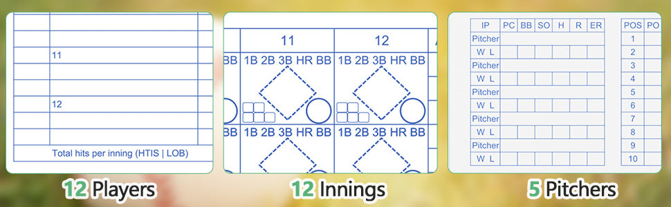- 【Scorekeeping Essentials】Our scorebook is designed for enhanced baseball and softball stats tracking, featuring 12 innings—3 more than standard scorebooks. It includes a 12-player lineup with 2 substitute lines per player and space to track pitch counts for up to 5 pitchers per game, enabling comprehensive stat tracking.